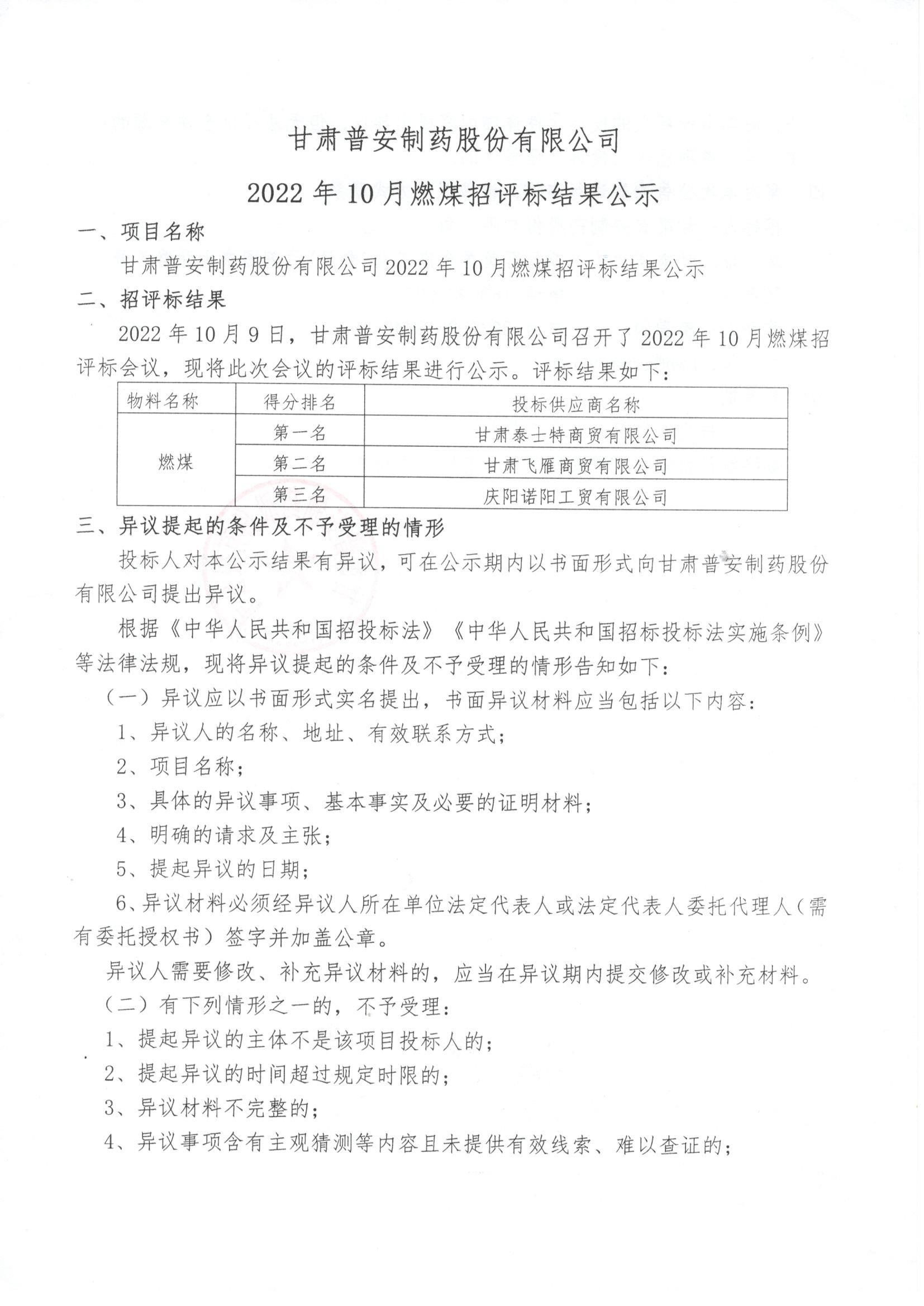 甘肅普安制藥股份有限公司2022年10月燃煤招評標結(jié)果的公示
