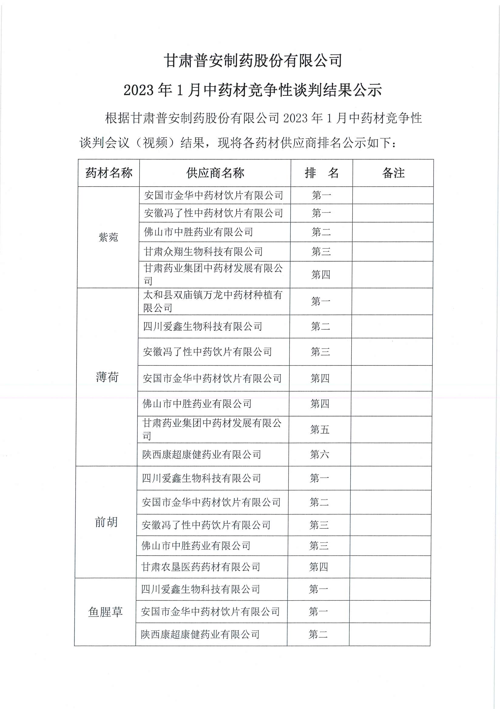 甘肅普安制藥股份有限公司2023年1月中藥材競(jìng)爭(zhēng)性談判結(jié)果公示