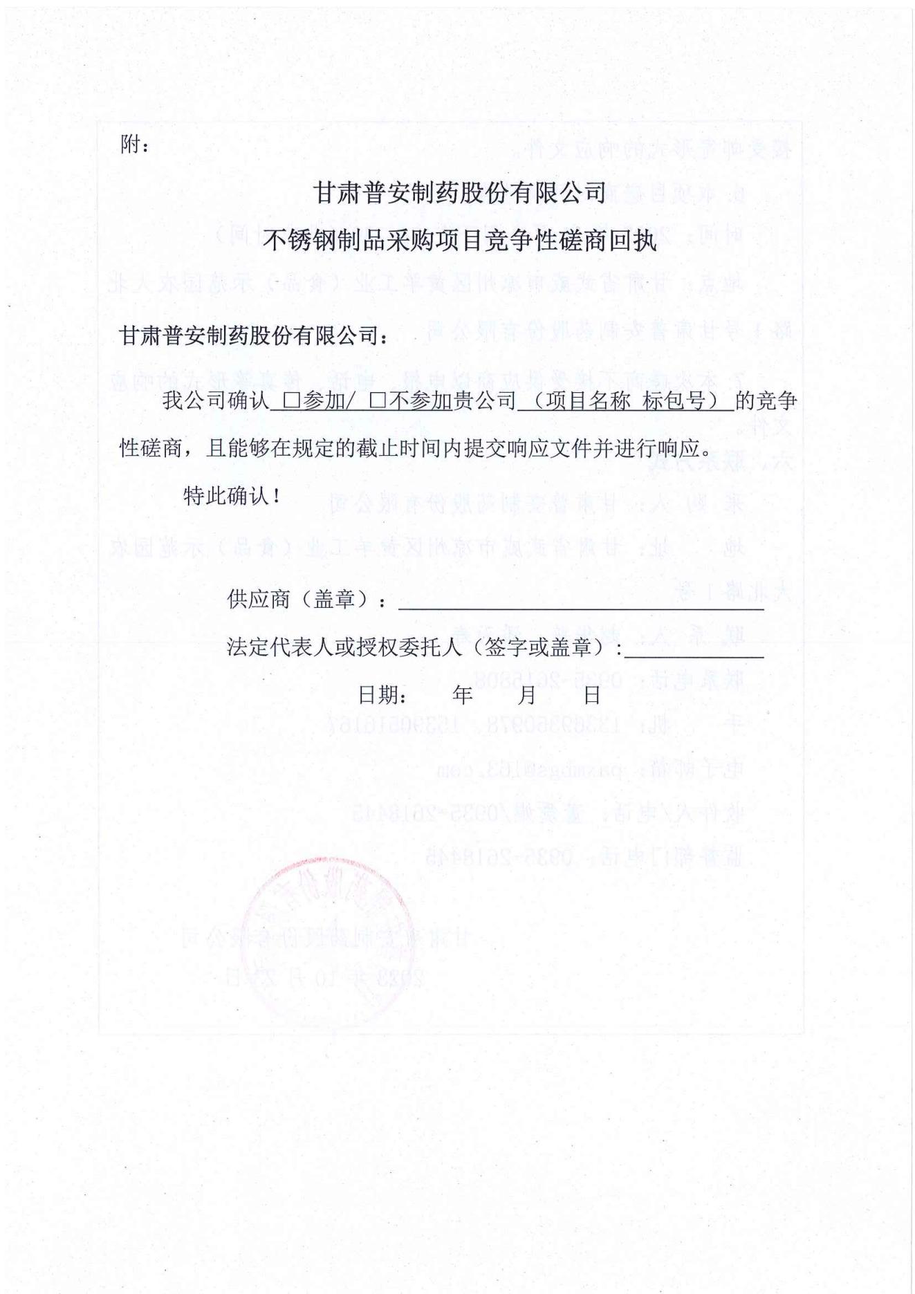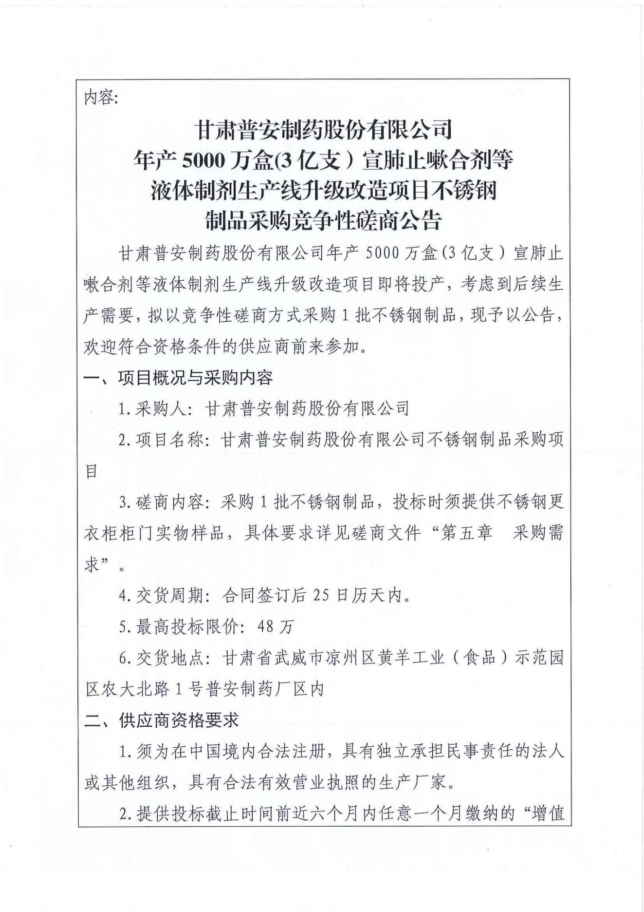 甘肅普安制藥股份有限公司年產(chǎn)5000 萬盒(3億支)宣肺止嗽合劑等液體制劑生產(chǎn)線升級(jí)改造項(xiàng)目不銹鋼制品采購競爭性磋商公告