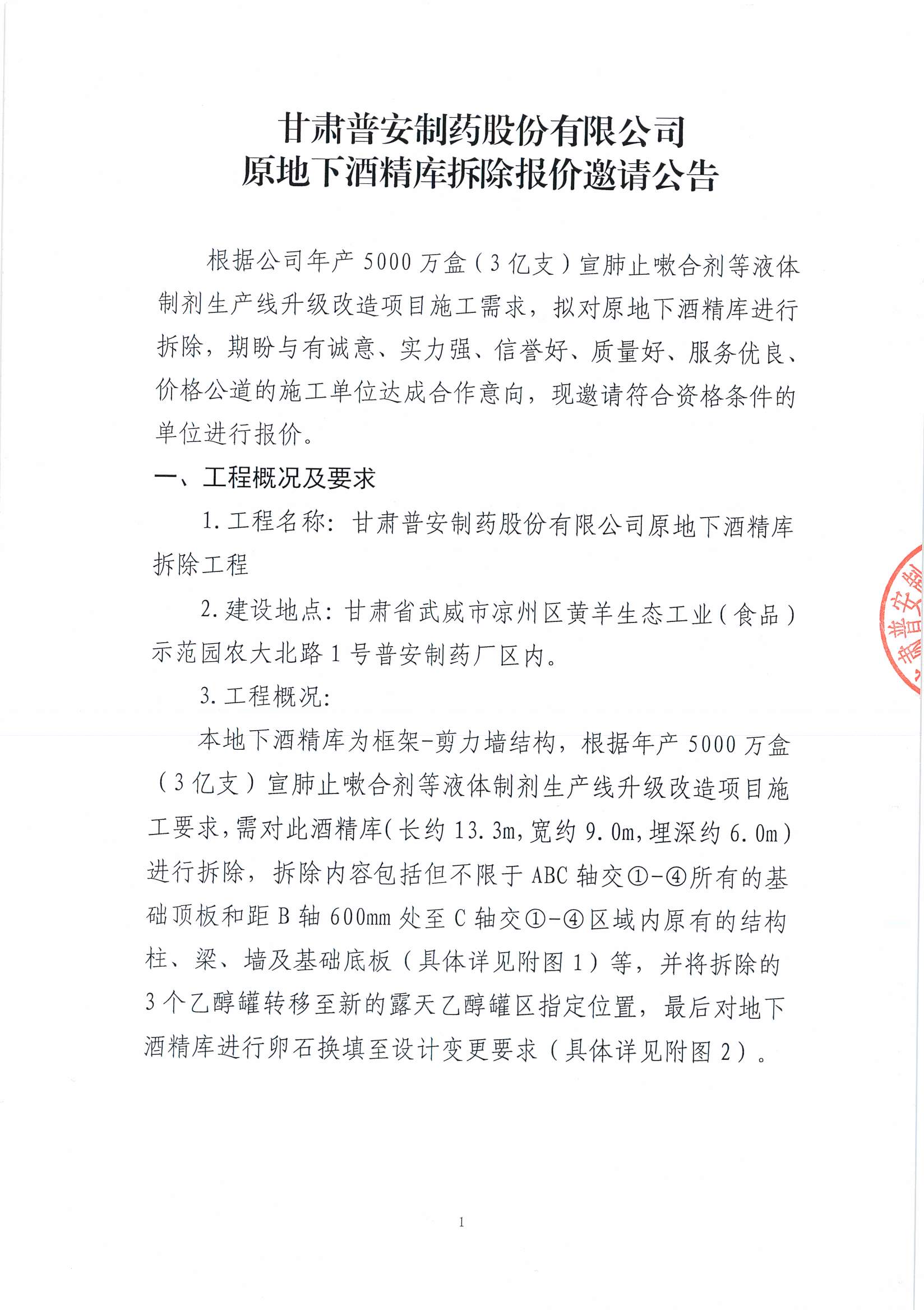 甘肅普安制藥股份有限公司原地下酒精庫拆除報價邀請公告