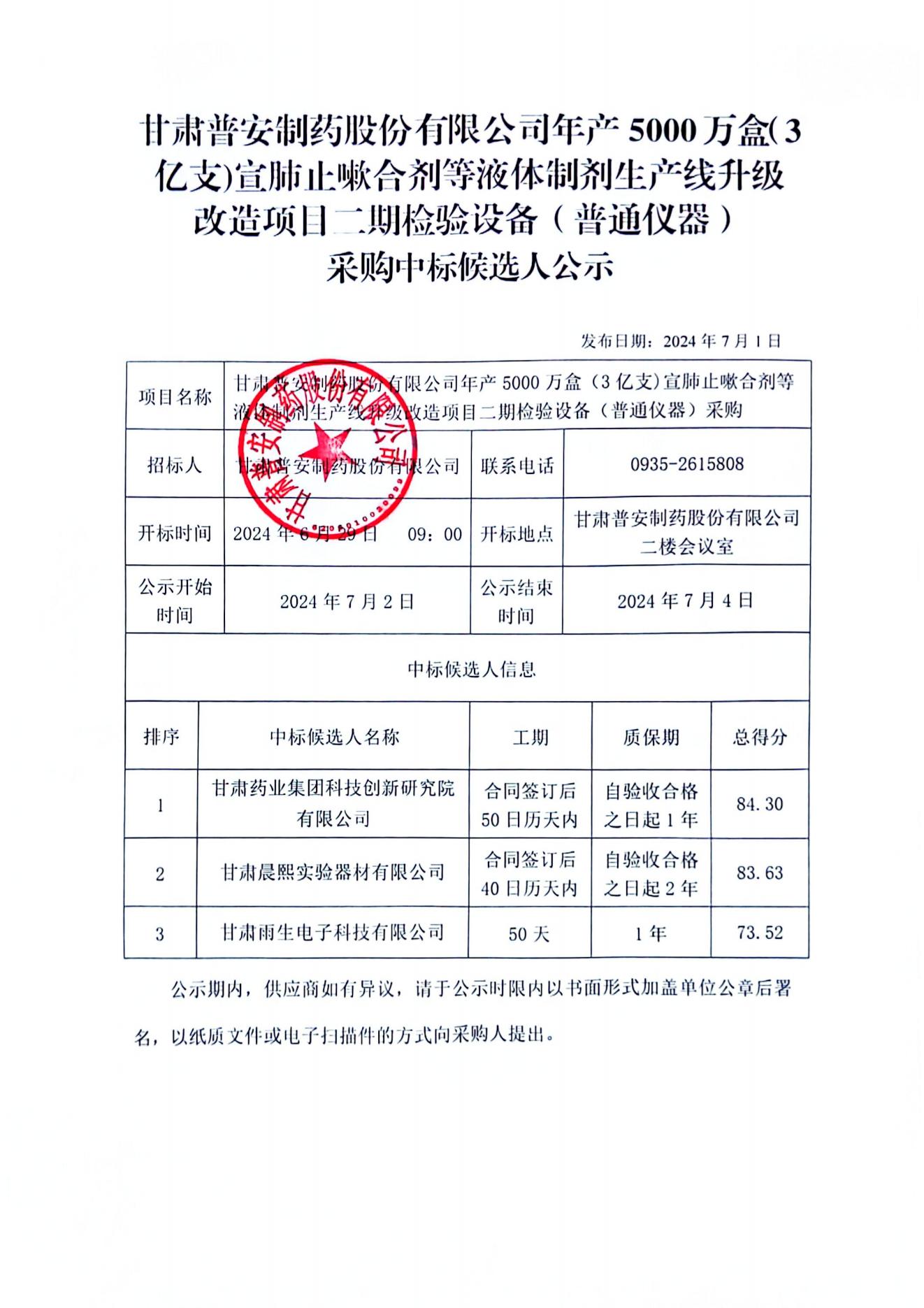 甘肅普安制藥股份有限公司年產(chǎn)5000萬盒(3億支)宣肺止嗽合劑等液體制劑生產(chǎn)線升級(jí)改造項(xiàng)目二期檢驗(yàn)設(shè)備(普通儀器)采購(gòu)中標(biāo)候選人公示