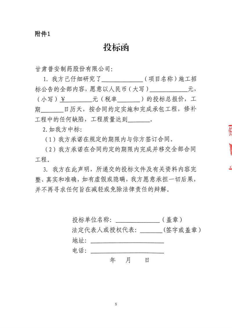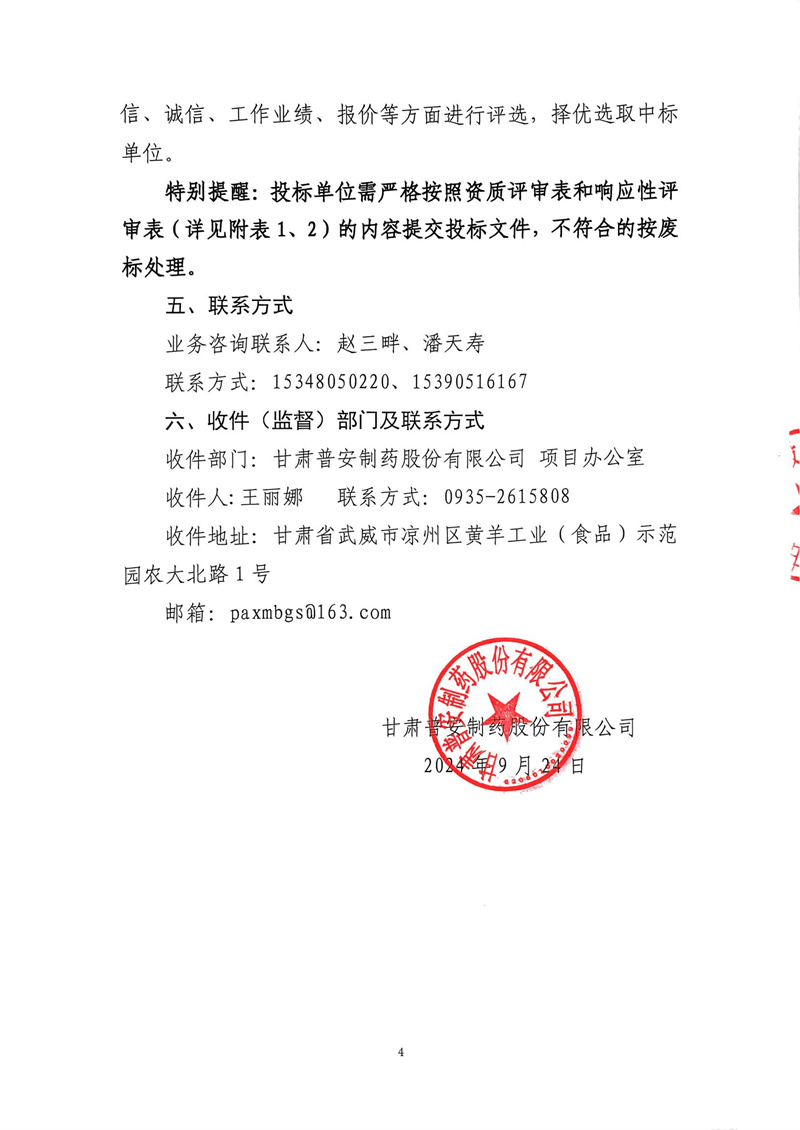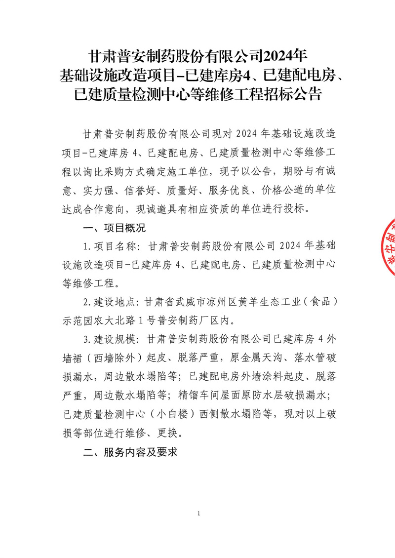甘肅普安制藥股份有限公司2024年基礎設施改造項目-已建庫房4、已建配電房、已建質量檢測中心等維修工程招標公告