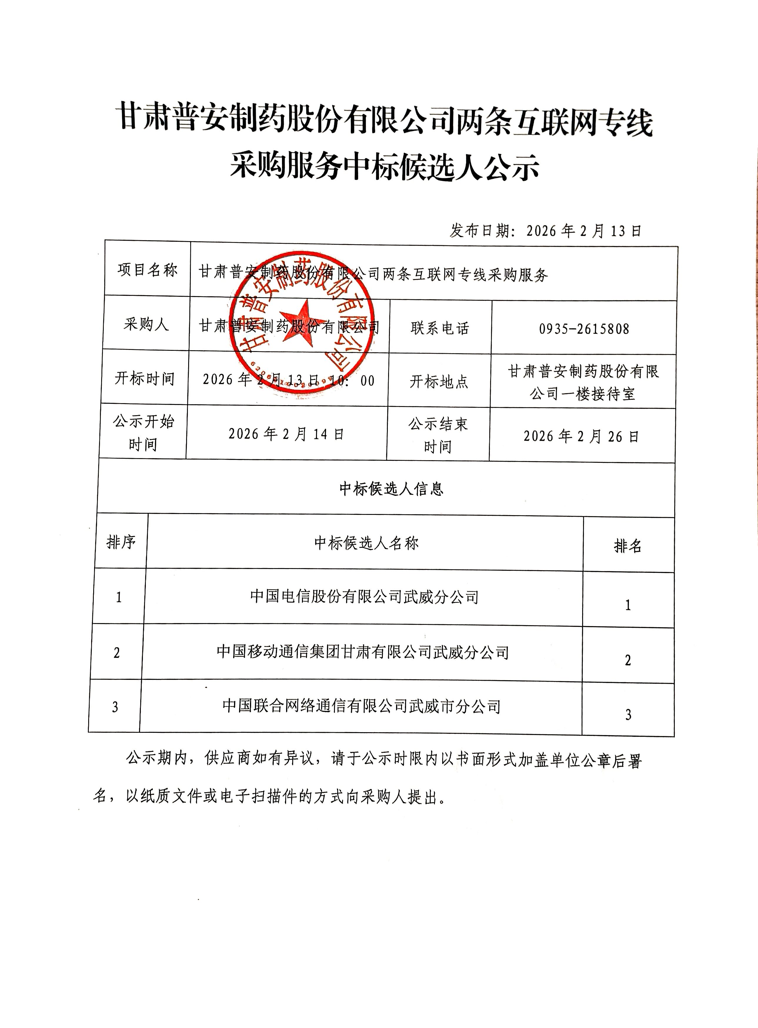 甘肅普安制藥股份有限公司兩條互聯(lián)網(wǎng)專線采購服務(wù)中標(biāo)候選人公示