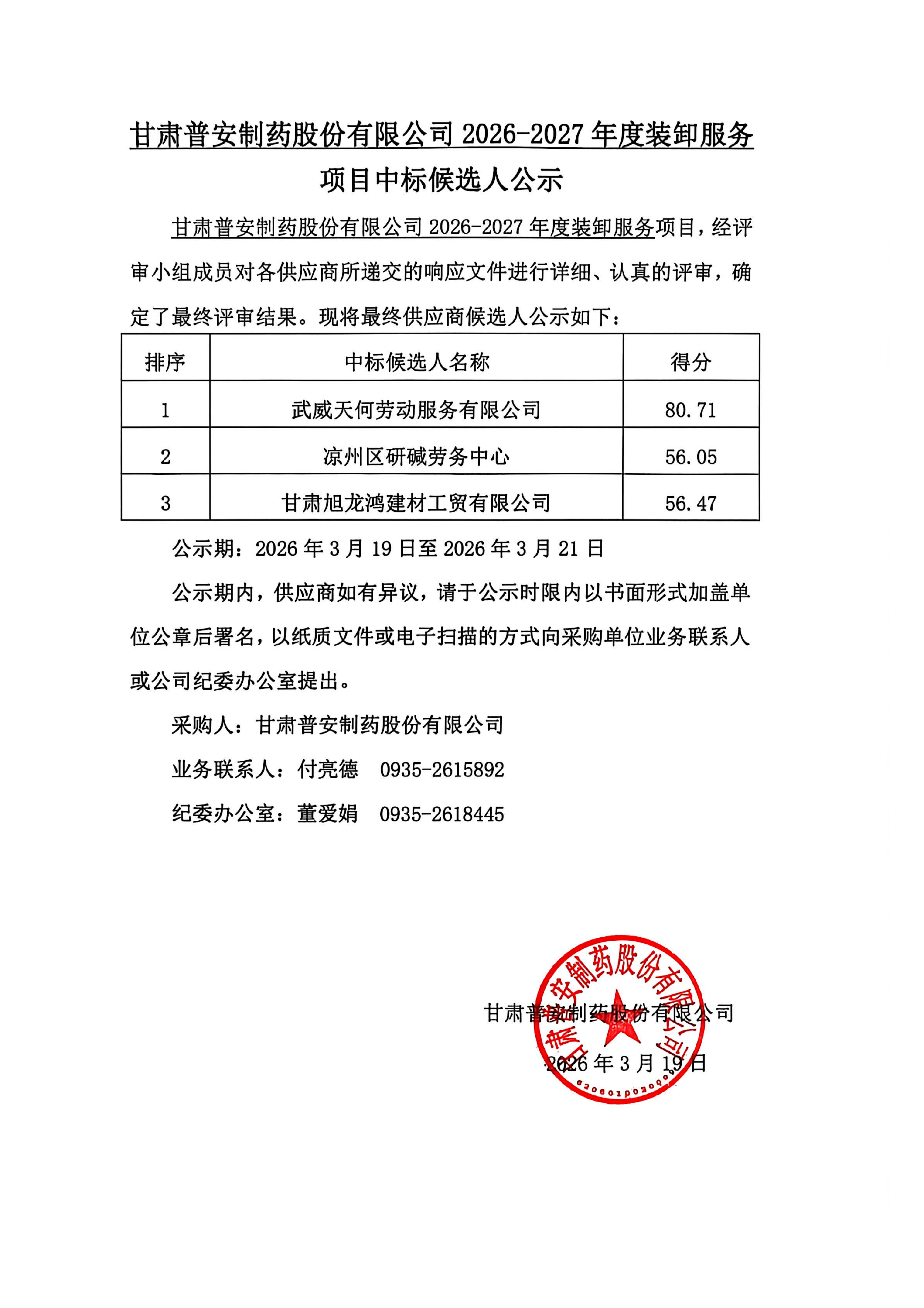 甘肅普安制藥股份有限公司2026-2027年度裝卸服務項目中標候選人公示